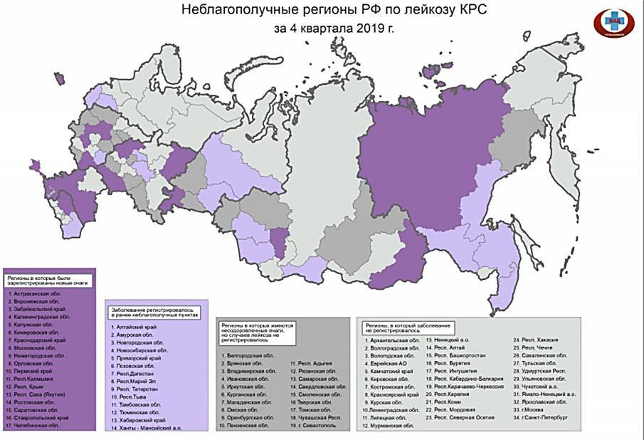 Россельхознадзор оценивает ситуацию с распространением в России лейкоза как “эндемичную”. За 2019 год в стране выявлено 356 неблагополучных по лейкозу КРС пунктов, в 2018 – 166. В ведомстве ожидают нарастающий тренд по неблагополучию хозяйств по лейкозу КРС.